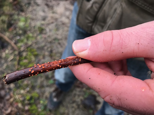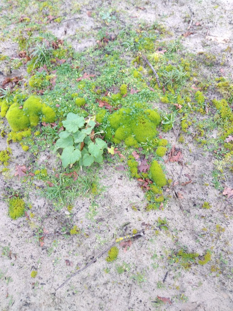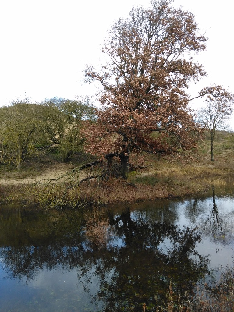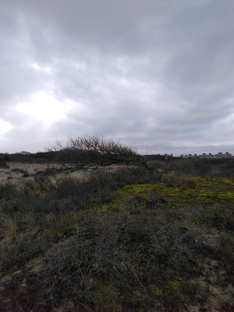 Eenmaal buiten het beschermde gebied om de natte pan was het voor mij weer bekend terrein, want we liepen daar op het zandpad waar ik de omslagfoto van mijn blog heb genomen. Toch was ook hier weer een en ander onbekend voor mij, want Eric wist ook hier weer wat dingen te vertellen en te laten zien die ik niet wist of had opgemerkt. Bijvoorbeeld een eik die zijwaarts gegroeid is door de wind. Ik had wel eens foto’s gezien van Aruba, Bonaire en Curaçao waar bomen op die manier groeiden door de passaatwind, maar hier in de duinen bij Den Haag had ik het nog niet gezien. Of liever gezegd, het was mij niet opgevallen terwijl ik al vaak op dat pad ben geweest. Andere dingen zijn dan weer zo klein dat je er een loep bij nodig hebt om ze te zien. Eric probeerde mij ook wat korstmos op een takje te laten zien, maar ik had zoals gewoonlijk weer ruzie met mijn fijne motoriek bij het gebruik van de loep. Het is uiteindelijk gelukt. Hierbij ook weer een paar foto’s:
